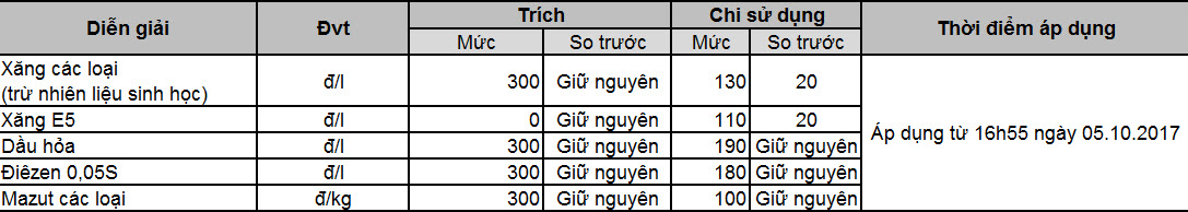 Mức giá mới có hiệu lực từ thời điểm 16 giờ 55 phút ngày 05 tháng 10 năm 2017 cho đến khi có thông cáo báo chí (TCBC) mới.